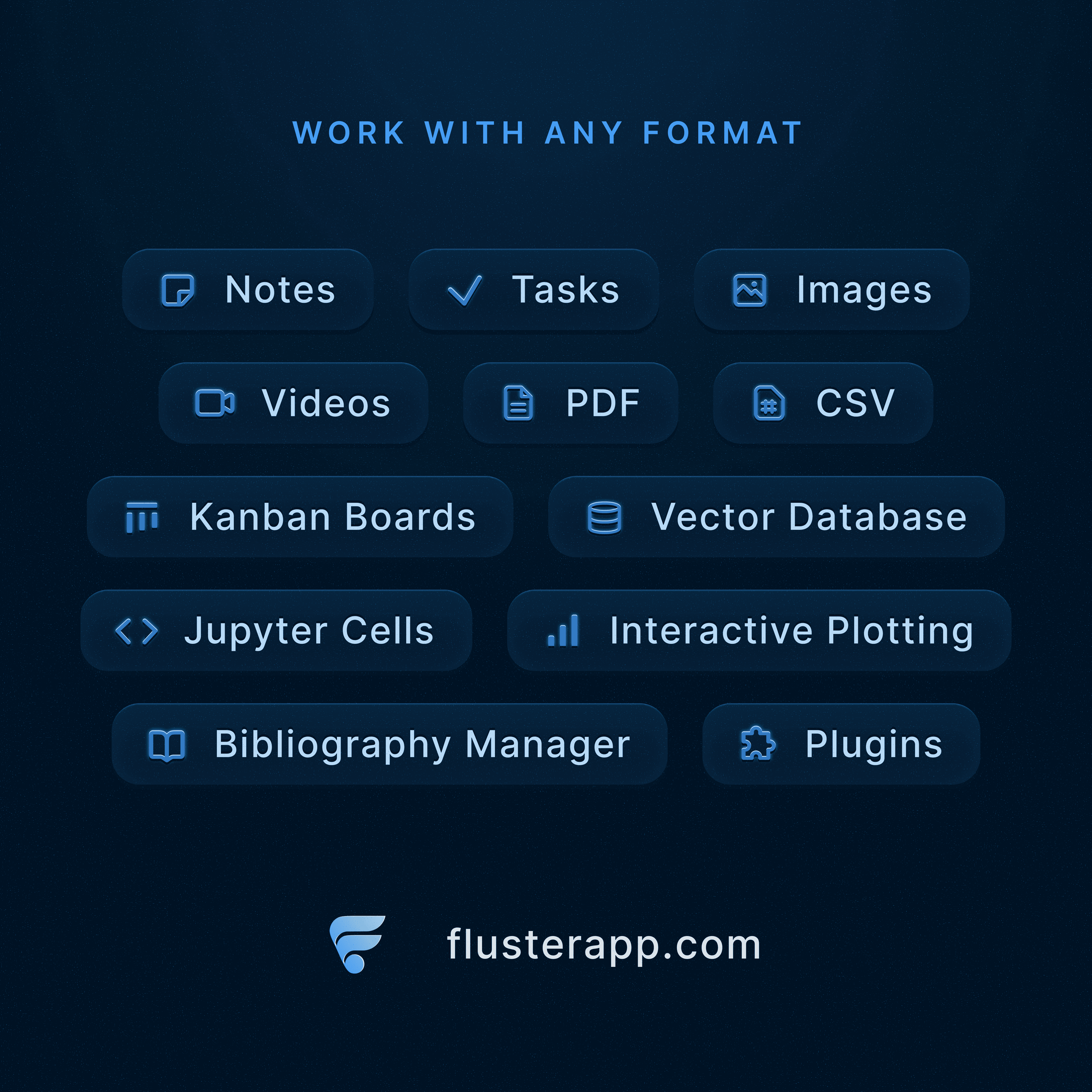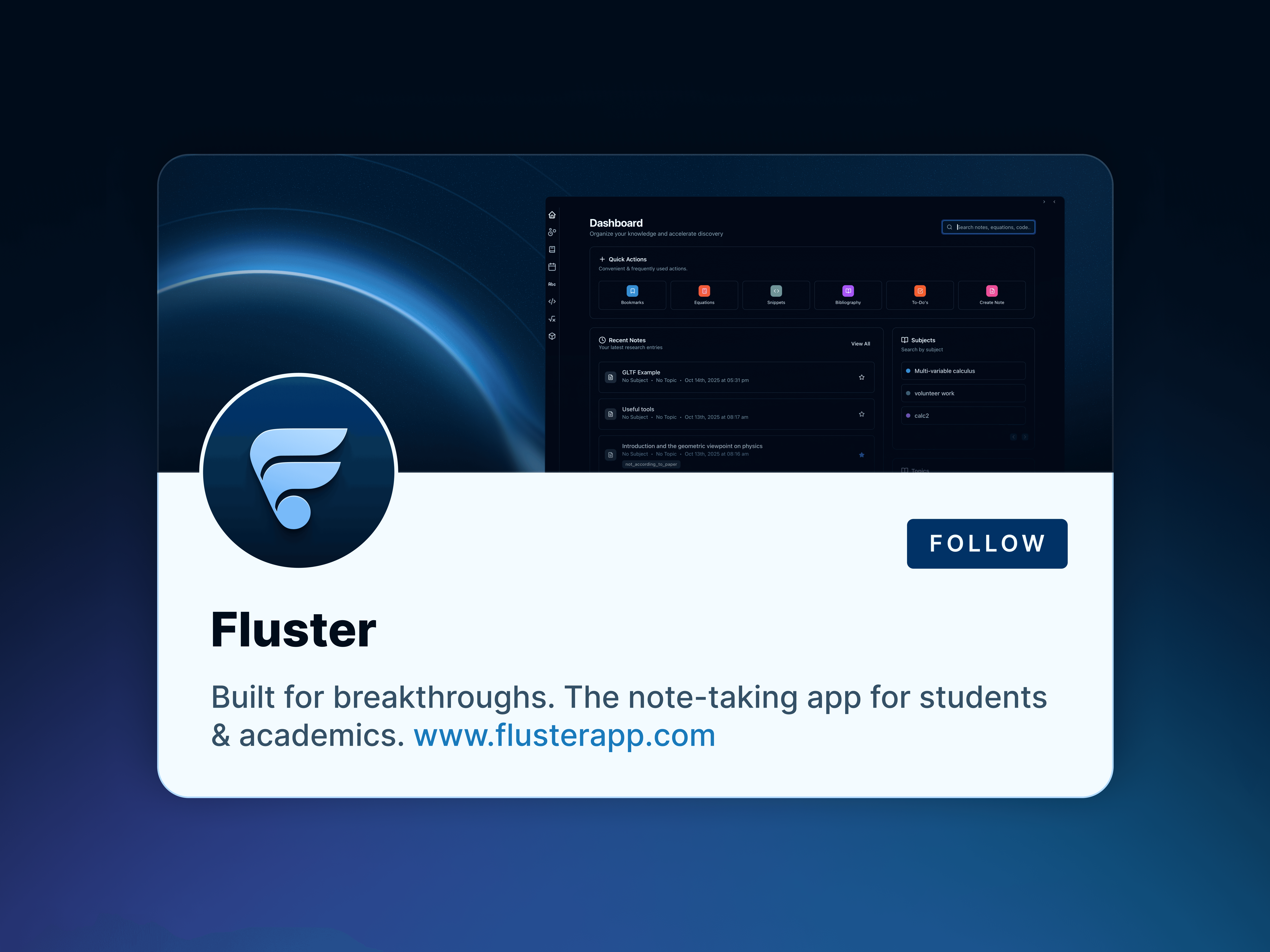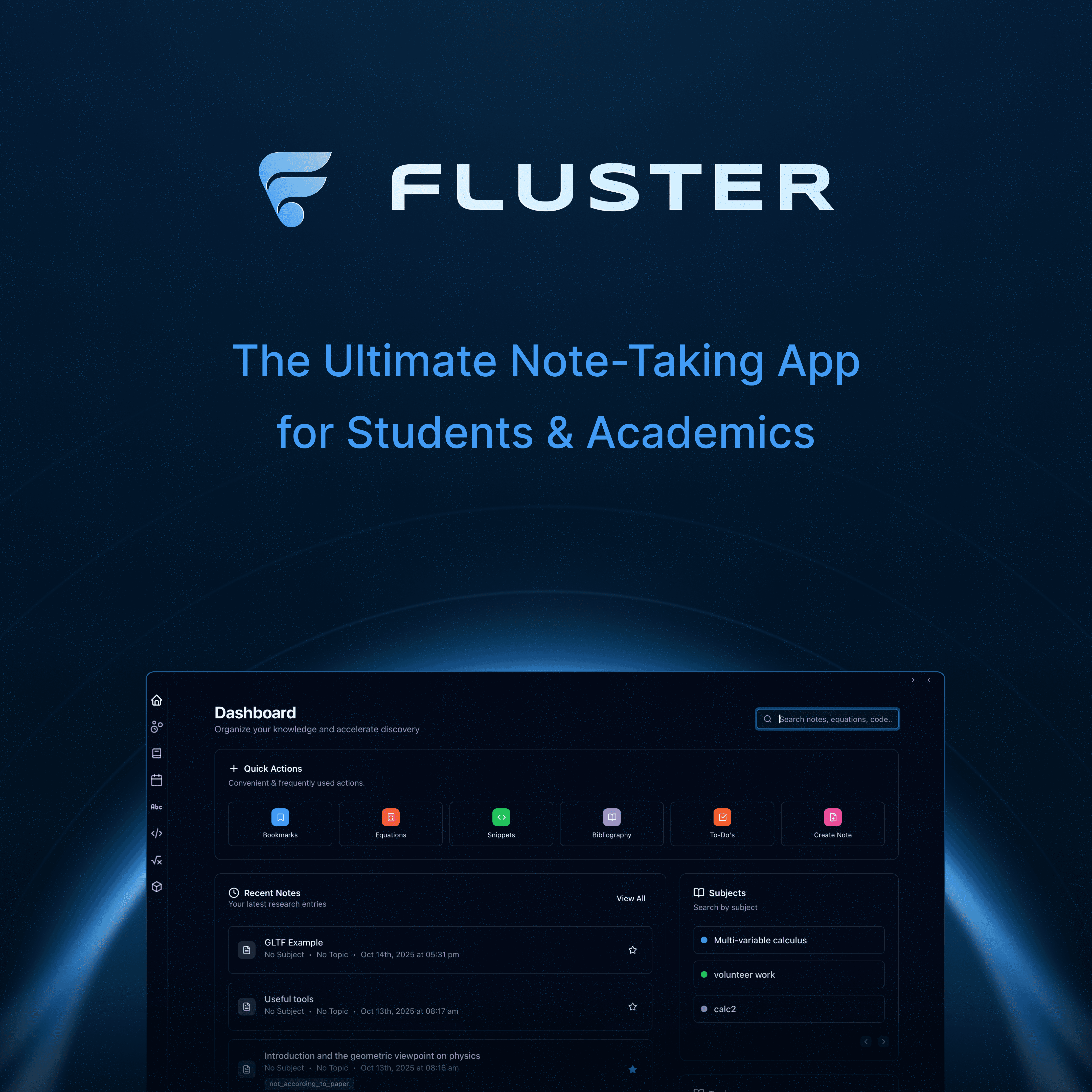 Fluster is a note-taking app for academics and students, made to support research, problem solving, writing, and complex projects. Built by a physics student for his own theoretical research, it offers features like Jupyter integration, LaTeX support, and bibliography management. I created a visual identity and marketing assets to give a professional visual presence to match its technical depth.