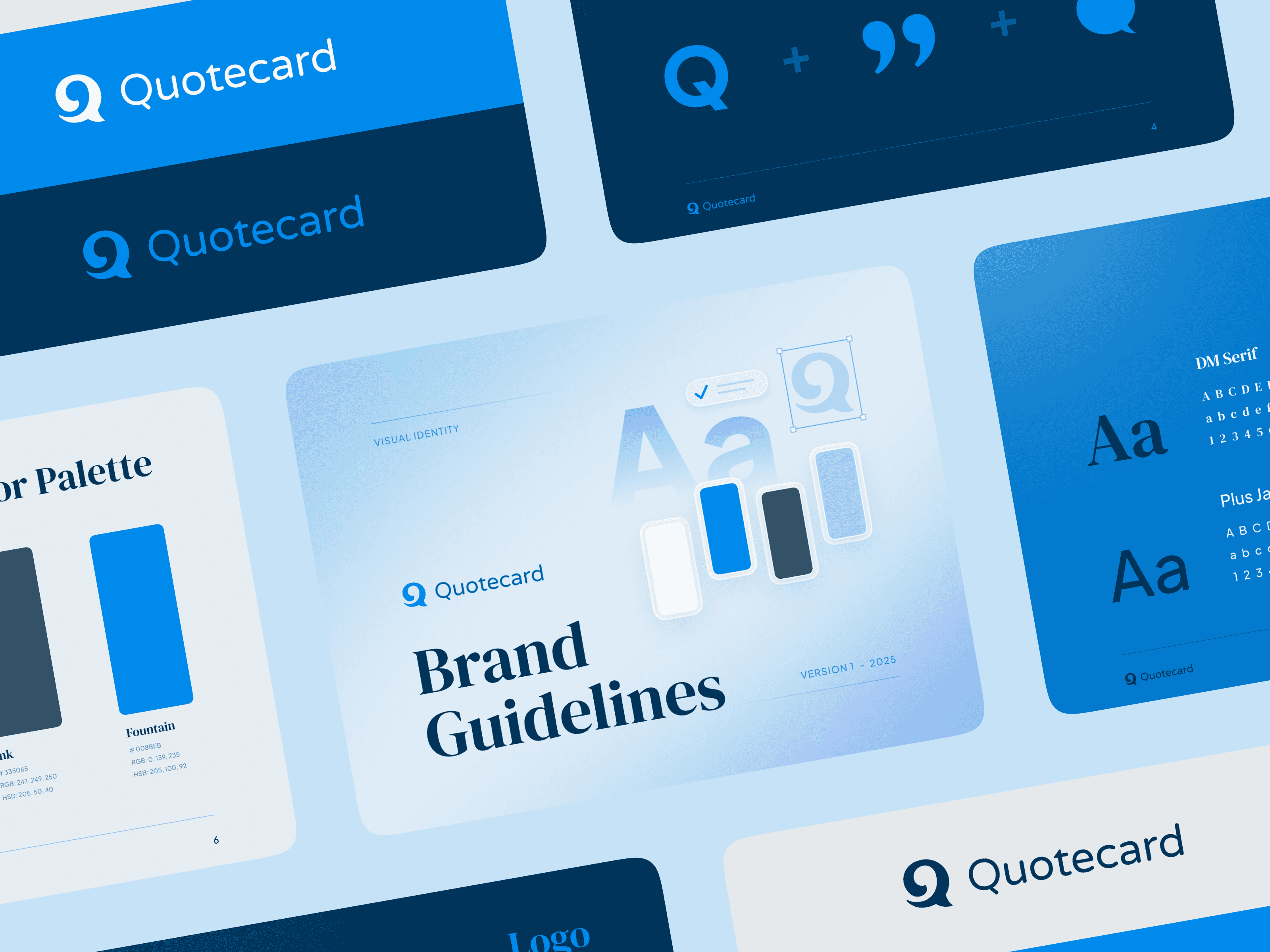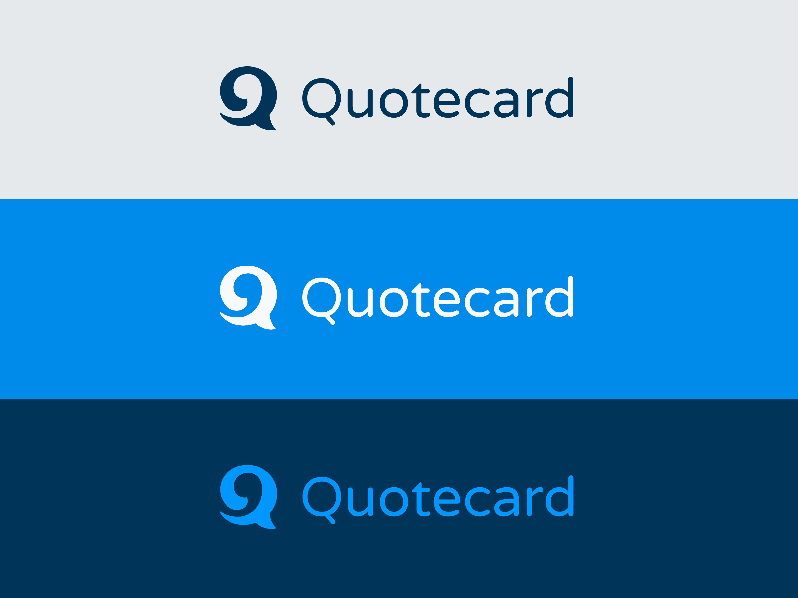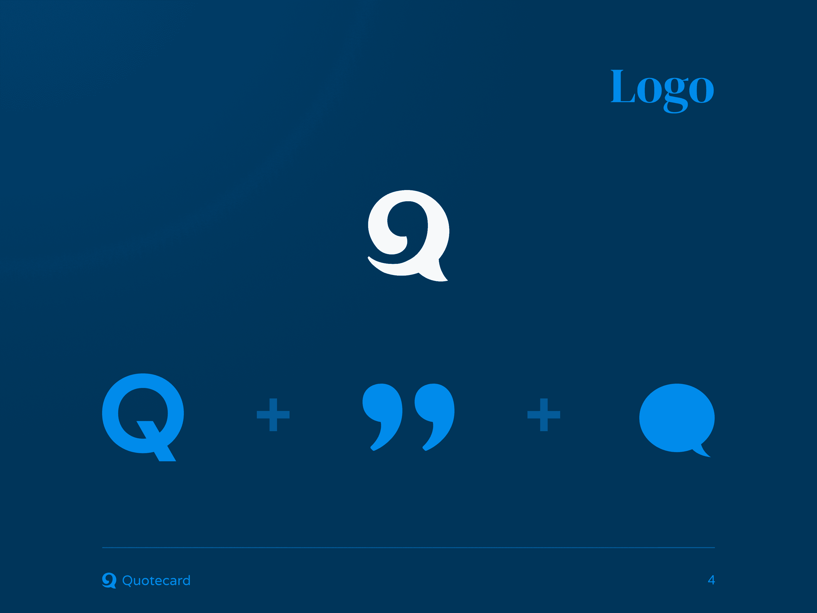 The logo combines a stylized “Q” with subtle references to quotation marks and speech bubbles, signaling conversation and ideas. The color system grew from a cool, versatile palette—dark blues for primary text, vibrant blues for actions, and soft, cool neutrals for cards and backgrounds—chosen to complement a wide variety of content imagery/color without clashing.