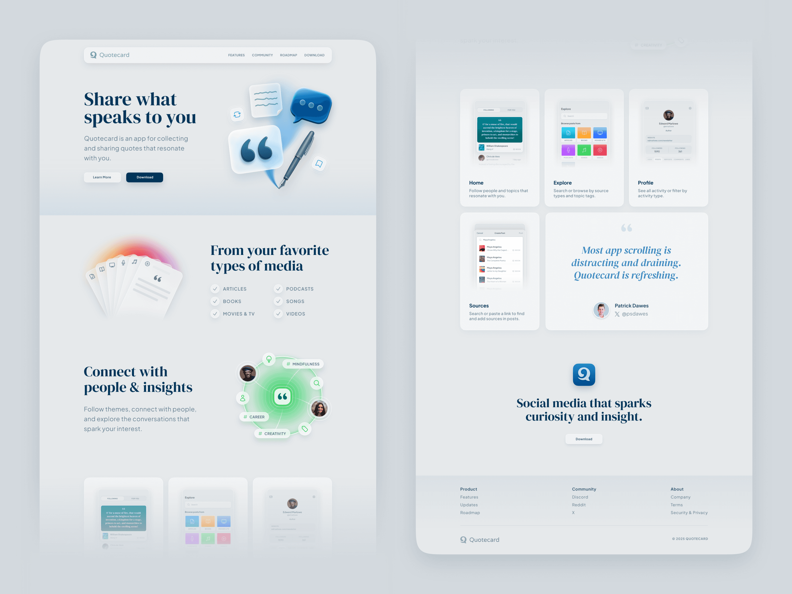 A challenge for the UI design was to make the text heavy, quote‑driven content feel distinct, clear and scannable. Each post visually separates the quote, source details, and user information. The goal for the landing page was to guide visitors through the product and its features at a glance, making it engaging and approachable.