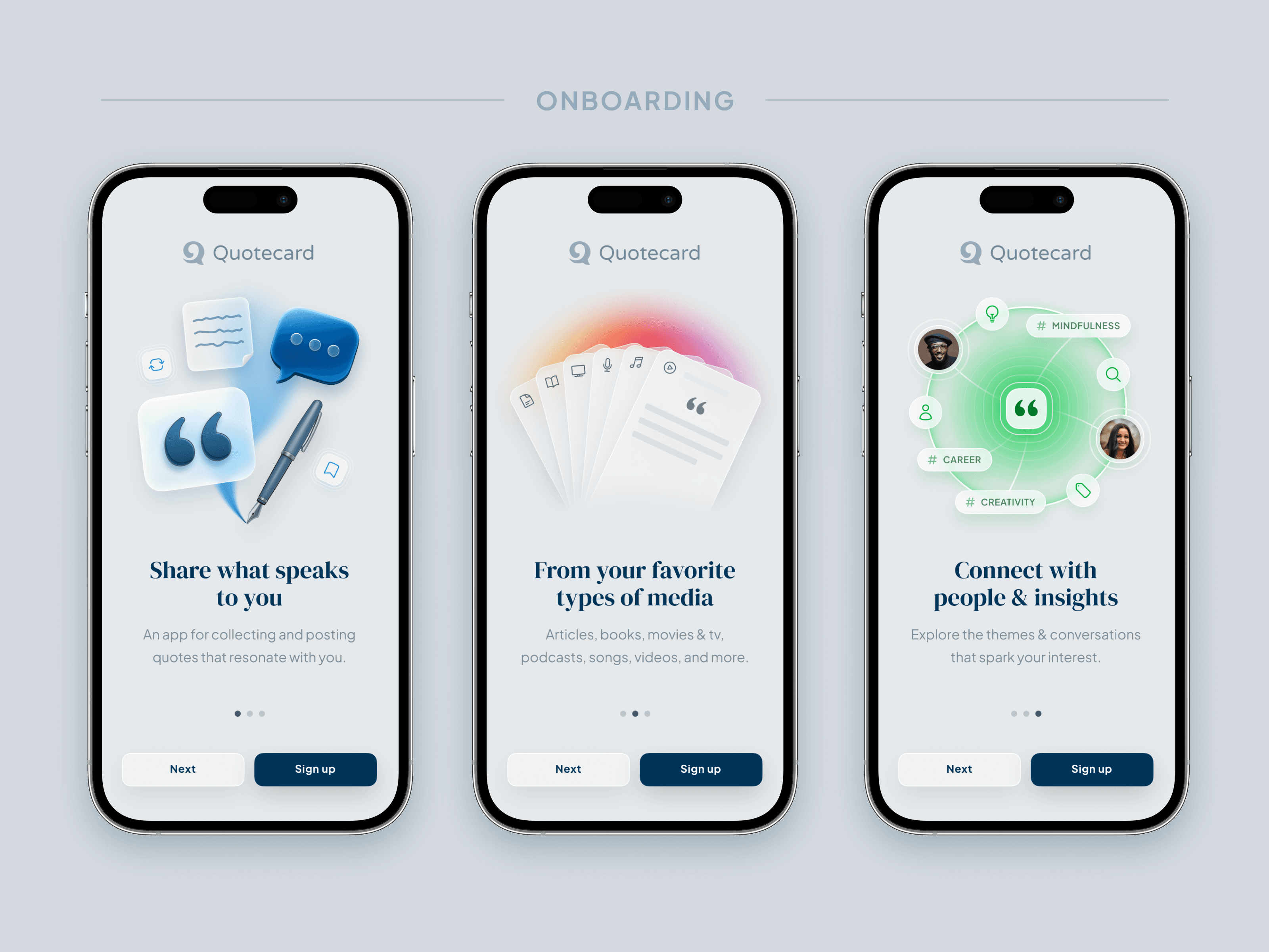 Quotecard is a brand and product direction centered on sharing quotes from books, podcasts, songs, videos, and other media. A visual design that carries through branding, illustration, app UI, and a web landing page—tying together expressive content with an approachable interface.